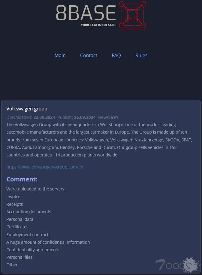 大众汽车集团发表声明回应勒索软件组织8Base的指控,该组织指控大众汽车集团窃取并泄露了其敏感数据。 这家德国汽车制造商坚称其核心 IT 基础设施未受影响;然而,该公司含糊的回应让人对事件的全部范围产生疑问,并引发了对可能存在第三方妥协的担忧。 勒索软件行动 8Base 自 2023 年初开始活跃,并于 2024 年 9 月浮出水面,声称全球最大的汽车制造商之一大众汽车遭遇重大入侵。 该组织以其 Phobos 勒索软件变种和双重勒索策略而闻名,声称于 2024 年 9 月 23 日窃取了一批机密文件,并威胁将于 9 月 26 日之前公开发布。