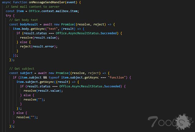 Varonis 研究团队证明,恶意行为者可以利用OnMessageSend事件来构造插件,该功能旨在允许合法应用程序在发送电子邮件之前对其进行处理。