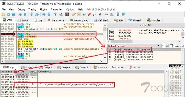 当 CVE-2018-0802 被触发时,shellcode 会从 retrodayaengineering[.]icu/HGG.hta 下载 HTA 并将其保存为 %APPDATA%\VA5.hta,然后通过 ShellExecuteExW 启动它。