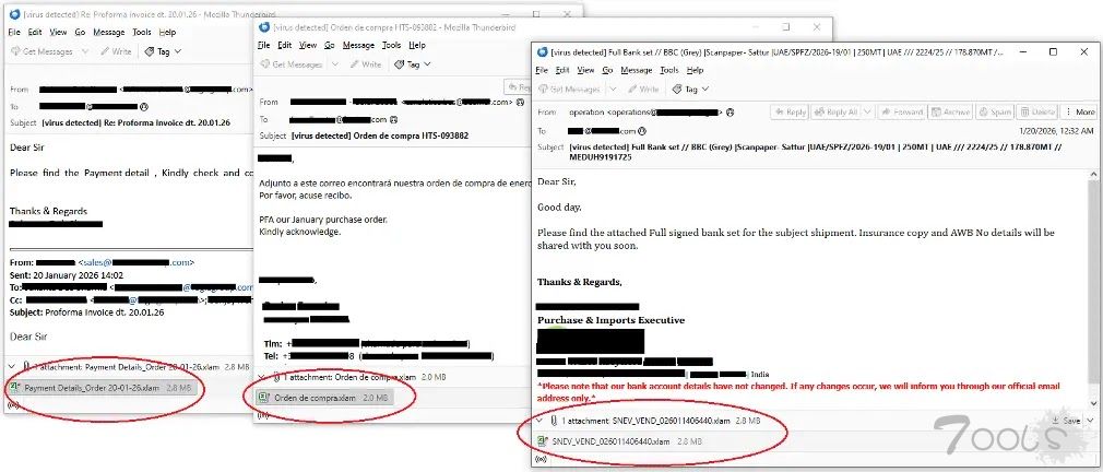 在最近的攻击活动中,攻击者使用了多种商业风格的电子邮件主题(例如付款详情审核、采购订单和已签署的发货单),诱骗目标打开恶意 Excel 加载项附件 (.XLAM)。