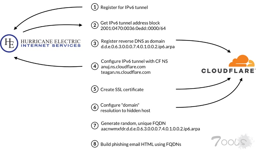 通过利用免费的 IPv6 隧道服务,攻击者能够获得对特定 IPv6 地址段的管理控制权。他们并未按预期创建反向 DNS 指针记录,而是为这些 .arpa 子域生成了标准的 A 记录。这就创建出了一些伪装成核心基础设施地址的完全限定域名,而安全工具通常会默认信任这些地址且极少进行审查。