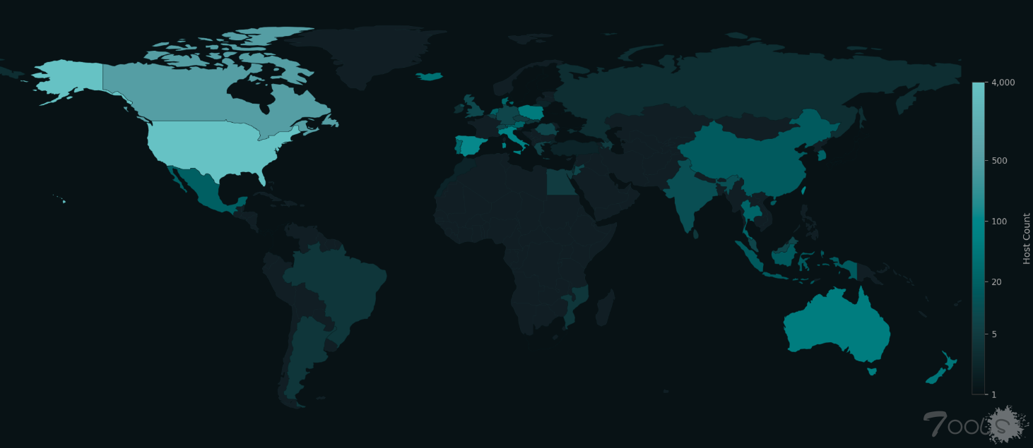 美国占全球暴露量的74.6%(3,891台主机),在蜂窝运营商ASN上的份额不成比例,表示蜂窝调制解调器上的现场部署设备。