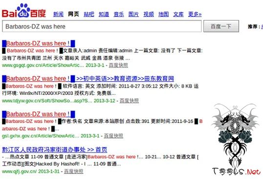 在百度和谷歌里搜索“Barbaros-DZ was here”,目前仍旧有大量的网站未被修复,黑页仍然可以访问。0