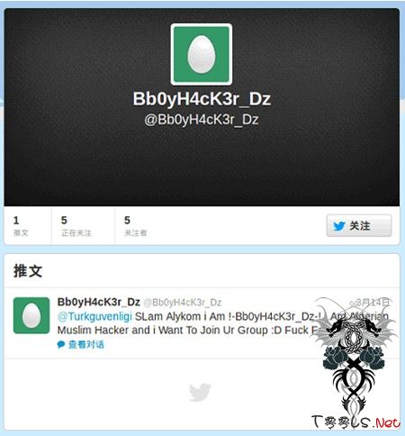 他发的推文中,粗鲁地说了一句“SLamAlykomi Am !-Bb0yH4cK3r_Dz-! , Am Algerian Muslim Hacker and i Want To Join Ur Group :D Fuck France”,表明了他对法国的厌恶。