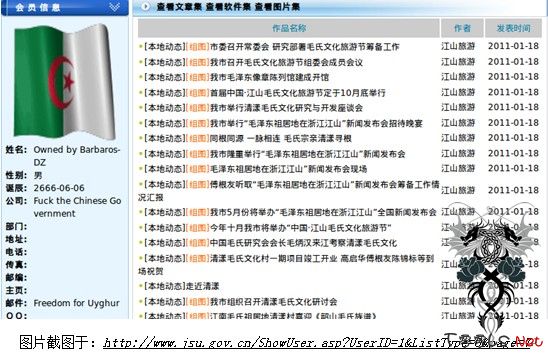 3、个别网站甚至连管理员权限都没有拿到,Barbaros-DZ仅是注册了一个帐号,在帐号公开信息部分中加入了挑衅中国政府的语句,如图:
