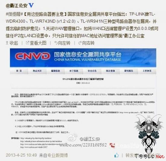 其实报告中黑客所使用的并不是什么新技术,早在一年多以前,我国的国家信息安全漏洞共享平台(CNVD)就收录了一条编号为CNVD-2013-20783的路由器安全漏洞,这个漏洞由波兰网络安全专家Sajdak发现,最早发现存在于TP-Link的产品中,后来Sajdak又陆续发现其他一些型号的路由器产品中也存在同样的漏洞,因此公布了相关信息,当时除了国家信息安全漏洞共享平台之外,各地的公安部门和网络安全机构也都同步发布了信息,以提醒广大网友注意检查和预防攻击行为。