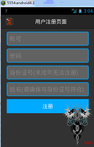 同时弹出一个登录框,只不过这个是个幌子,怎么输入都会出现密码错误或者账户不存在,将用户导入到一个注册页面:RegisterActivity中