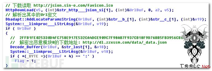 2、模块A访问http://jsion.sin-o.com/favicon.ico,读取解析其中隐藏的下载链接并解密,然后访问此链接下载模块B,解密后再次内存装载运行。