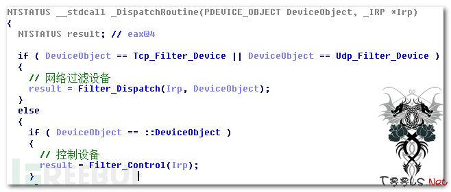 4)、网络过滤驱动程序内容比较简单,通过挂载tcp/udp驱动设备,对常见杀毒软件进程访问网络进行过滤屏蔽。
