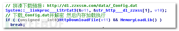 6、模块D访问远程服务器下载http://dl.zzxssm.com/data/_Config.dat(模块E),解密后继续在内存中直接加载运行。