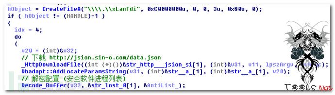 3)、随后尝试打开网络过滤驱动设备,如果成功则联网下载http://jsion.sin-o.com/data.json并解密,内容为主流杀软的进程列表,然后通过DeviceIoControl将格式化后的杀软进程列表数据发送给驱动程序。