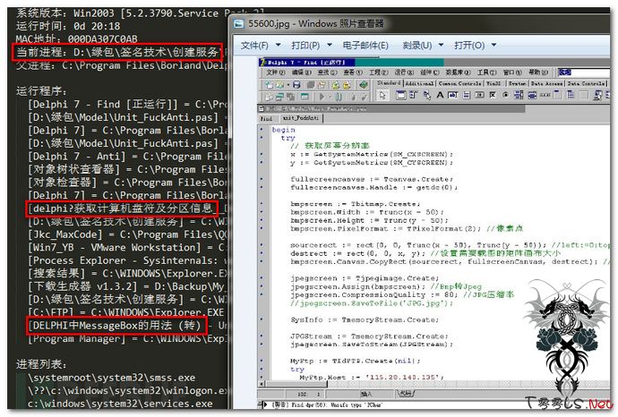 (3)、病毒作者在测试样本的时候也上传了一些调试信息,包括系统信息、代码截图等。可以发现一个有趣的细节,作者当时正在浏览一篇网页“DELPHI中MessageBox的用法”,从这个细节中我们可以看出作者可能是个delphi编程的初学者。