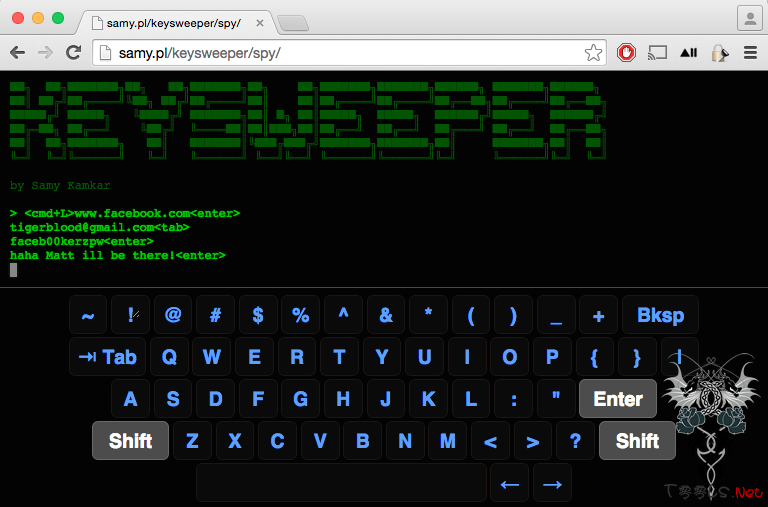 KeySweeper 基于 Web,自动侦测到用户输入的关键词、用户名、URL 信息,继而记录。它利用了无线键盘的部分漏洞,比如所有键盘 MAC 地址开头的字节是相同的。KeySweeper 通过这些漏洞,不需要键盘的 MAC 地址也能轻松解码附近无线键盘的键入内容。