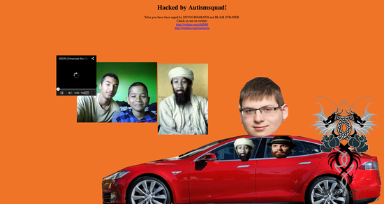 而特斯拉官方网站同样未能幸免,其主页被改成了一幅粗制滥造的拼贴画。