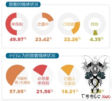 知乎上曾有一篇关于黑客黑入隔壁女神WiFi并最后追到手的文章,所以人们的印象中,黑客远比只会修电脑的屌丝男更神秘,更有魅力。而事实却并非如此,根据报告显示,黑客中单身的比例近5成。悲剧的是8成小白认为黑客已经名花有主,想要脱单可谓困难重重。