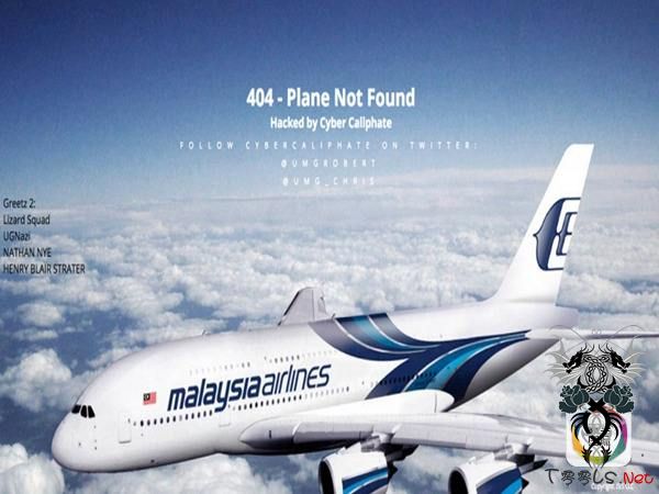 图为今年1月马航官网被黑后的显示页面,飞机上文字写着“404-飞机没有找到”。(资料照片)
