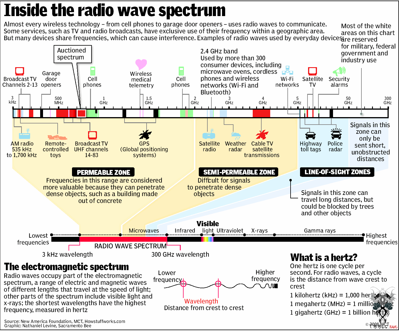 如果你仔细观察过无线电频谱,就会发现导航、通信、广播、雷达、电视、电话、近乎人类全部的信息传输都基于无线电,100 多年前人类发现所发现的能承载信息的电磁波如今已经渗透到每个人生活的方方面面。Wi-Fi 和手机是最常见的应用,GPS、NFC 只是间接存在于种种设备之中而很少被被人们注意到,电脑上的网卡、手机上的蜂窝、车钥匙的射频等通信全部包含在这庞大的频谱中。