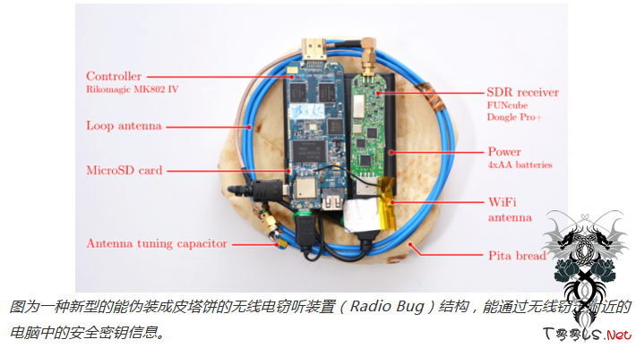 图为一种新型的能伪装成皮塔饼的无线电窃听装置(Radio Bug)结构,能通过无线窃走附近的电脑中的安全密钥信息。