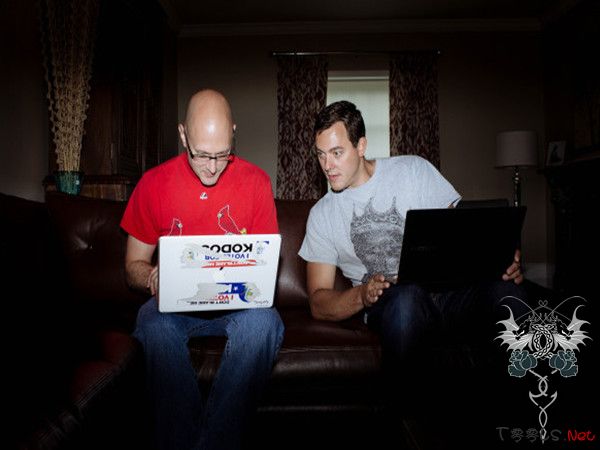 车载显示屏上出现了两个抱着笔记本电脑坐在沙发上的人。