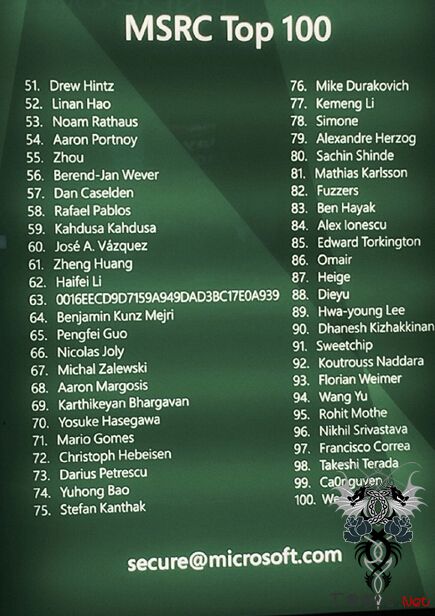 附:微软MSRC TOP100黑客贡献榜完整名单