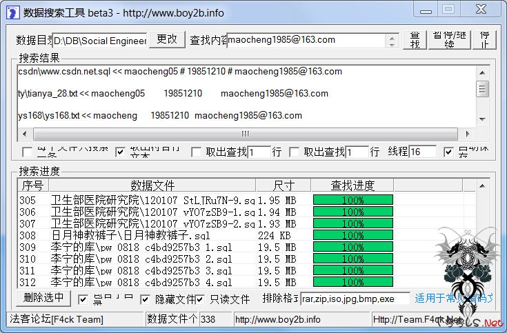 (2)通过目前拥有的已经公开的Social engineering Database,查找到指定人,然后通过特征信息生成字典。目前已知社工库大约30多G。各位亲要小心了。