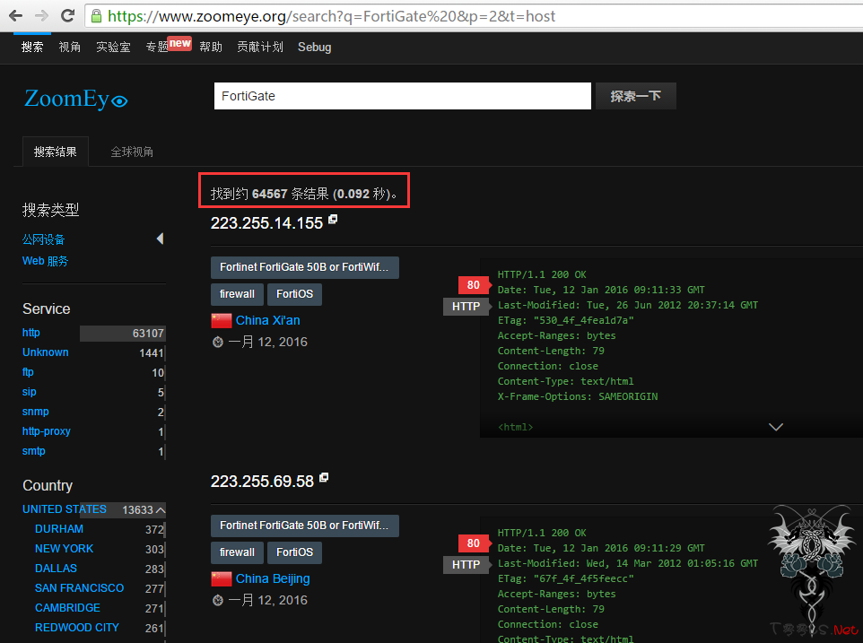 通过过Zoomeye搜索发现存在 64567台主机,