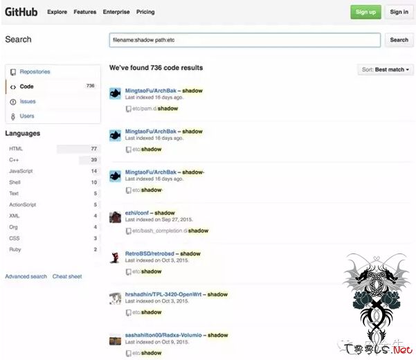 成就此文时,用这个检索项可以找出736条Unix系统的shadow文件。对Unix稍有涉猎的人都知道,/etc/shadow文件包含了系统中所有用户密码的哈希值。