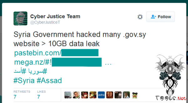 黑客组织Cyber Justice Team(网络正义小队)在MEGA文件托管服务平台上上传了10GB来自叙利亚多个政府以及私营网站的压缩数据--解压后则有43GB。另外,该组织还在PasteBin上上传了来自叙利亚国家网络服务机构一台Linux服务器上的密码文件。