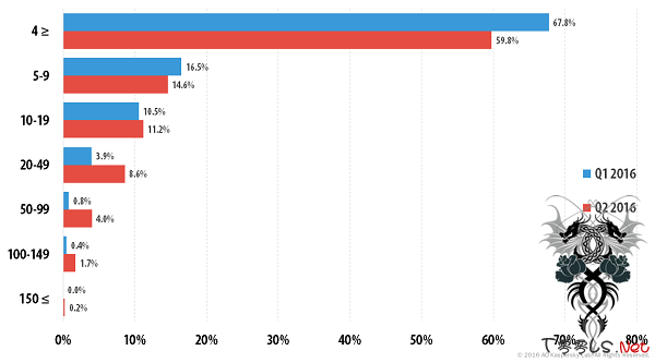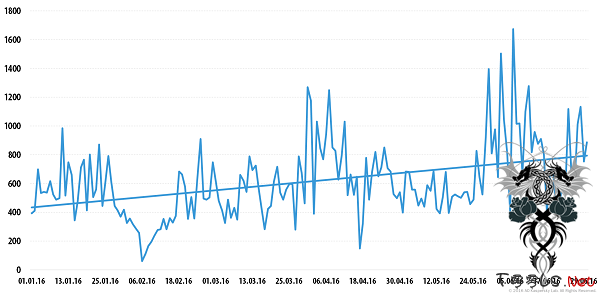 2016年2季度,DDoS攻击的“时间线”并不均匀,其中四五月份较缓和、但六月份高发。在六月的其中一天,卡巴斯基曾检测到1676个不同的DDoS攻击。