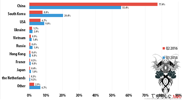 僵尸网络“命令与控制”(C&C服)务器方面,韩国以69.6%高居第一,其次是中国(8.1%)、美国(7.1%)、俄罗斯(4.5%)、以及巴西(2.3%)。