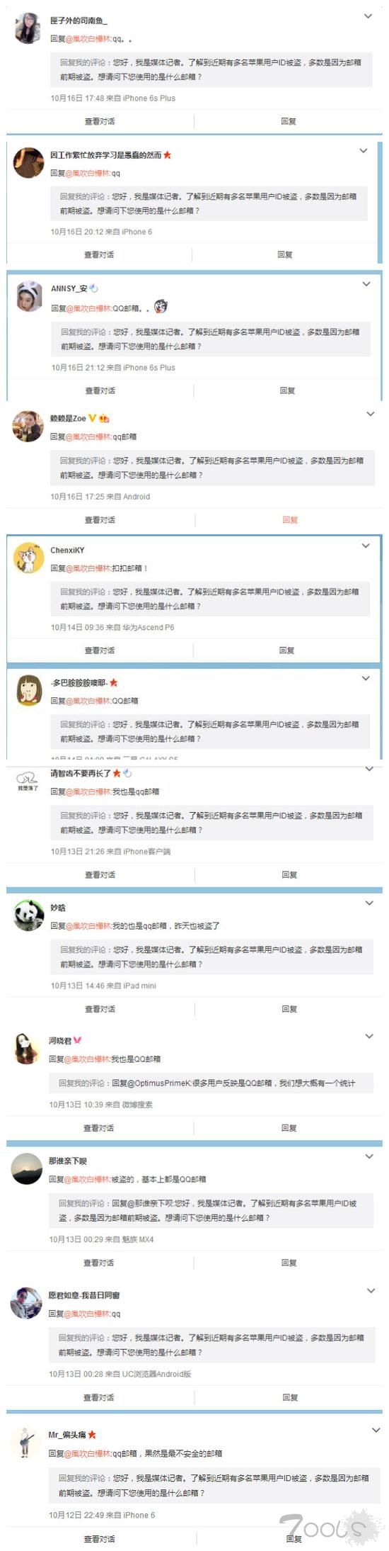 网易科技在微博上以“Apple ID被盗”为关键词进行搜索,从10月7日到10月16日为期十天的调查中,记者共统计了86名苹果账号被盗的微博用户,33人回复了记者,其中27人使用的是QQ邮箱,占比高达82%。