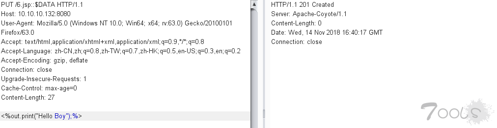 在 Windows 服务器下,将 readonly 参数设置为 false 时,即可通过 PUT 方式创建一个 JSP 文件,并可以执行任意代码。Tomcat 7.x版本内web.xml配置文件内无readonly,需要手工添加,默认配置不受此影响。