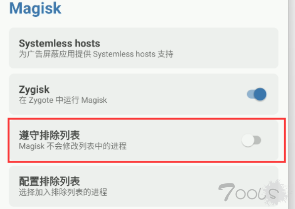 ● magisk设置——配置排除列表——勾选app(此处的操作是为app隐藏root,及没有通过root启动app)