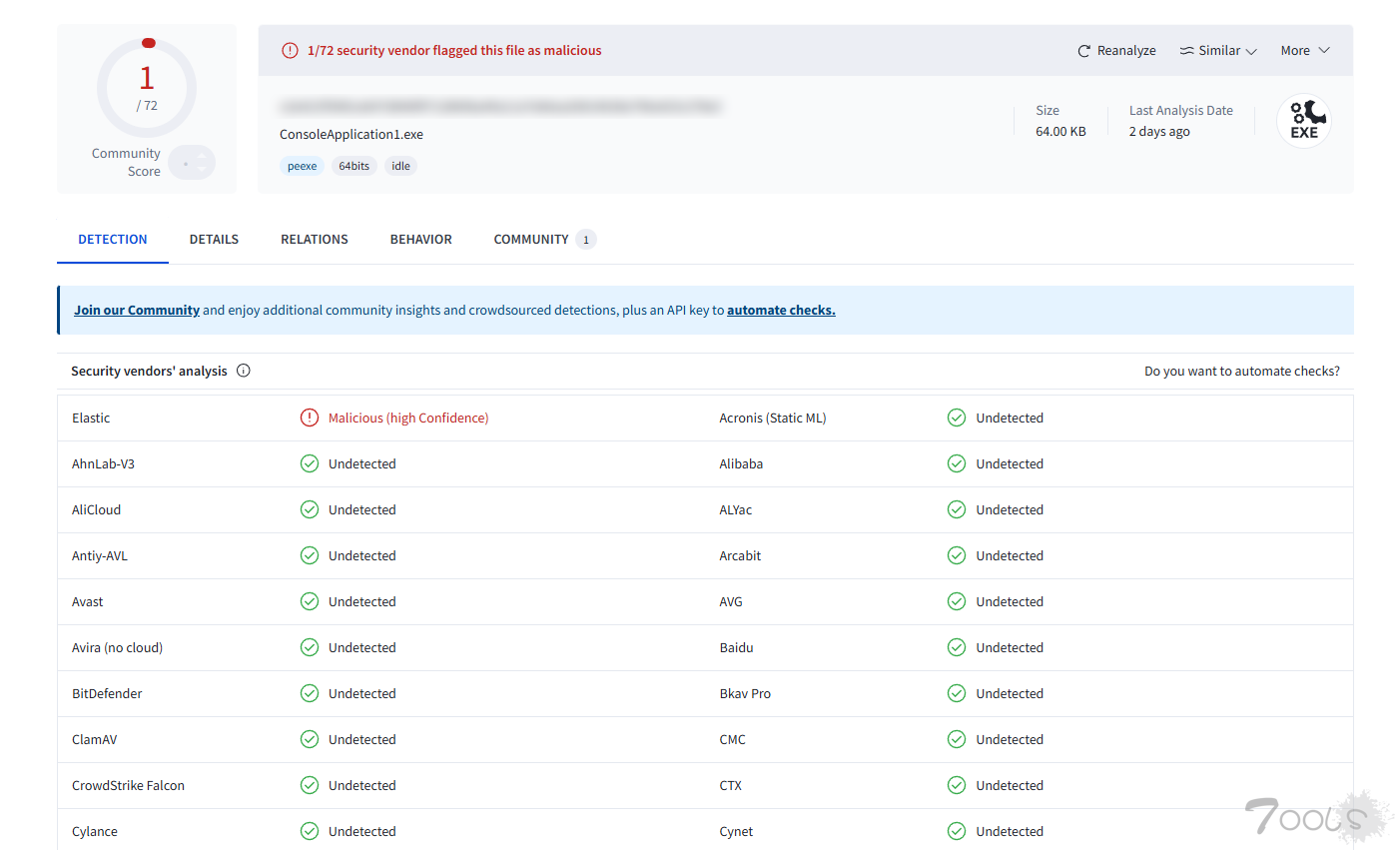 vs编写的马子编译后,上传VT检查一下查杀率时,VT 1/72,发现总是有一个Elastic阴魂不散。。