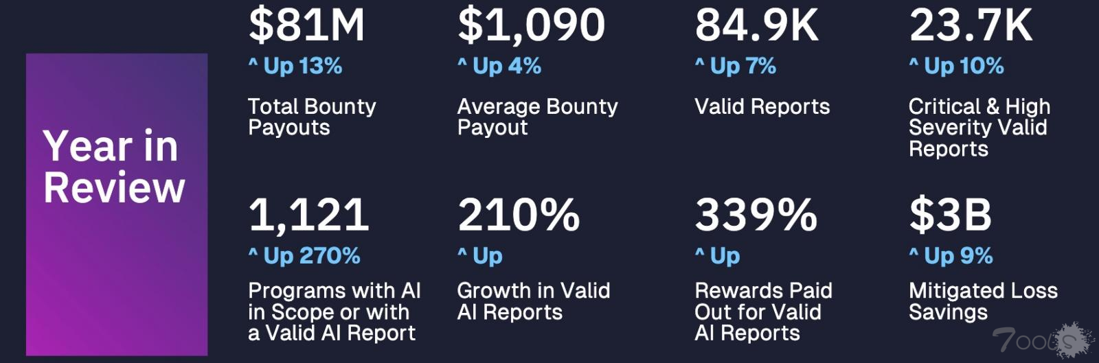 HackerOne,漏洞悬赏领先平台在过去的一年中向全球的白帽黑客支付了赏金达8100万美元。HackerOne管理1950+个赏金项目,并为多个机构提供漏洞披露、渗透测试以及代码安全服务。根据本周早些时候发布的报告,所有活跃的赏金项目年均支付额在42000美元,在平台排名前10的项目支付达2160万美元;前100的项目共支付5100万美元。(2024/07/01-2025/6/30) 。全年总支付8100万美元,同比增长13%。从提交者角度看,历史收入榜前100名白帽总收入达3180万美元,部分个人年收入突破6位数。