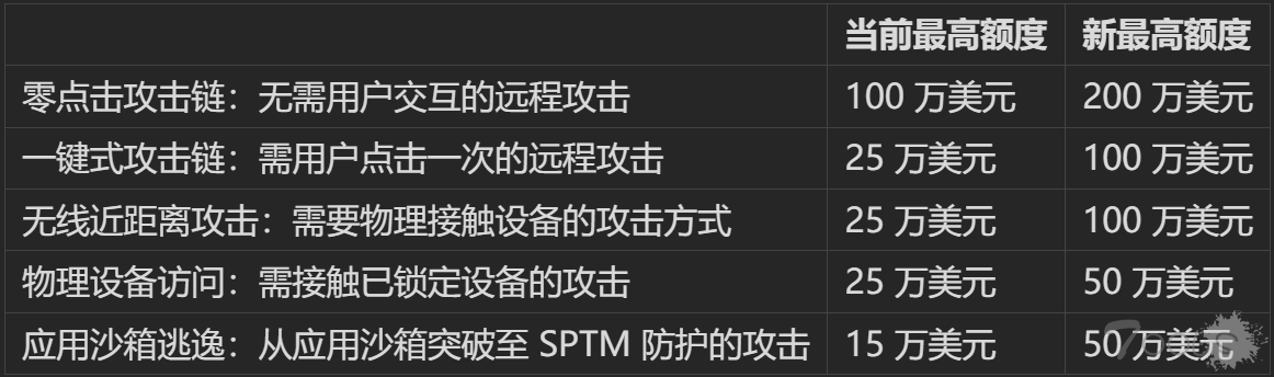 "我们将最高赏金翻倍至 200 万美元,奖励能达到复杂商业间谍软件攻击同等效果的漏洞利用链。"苹果发布的声明中写道,"这是业内前所未有的金额,也是我们所知所有漏洞赏金计划中的最高报价——而我们的奖金系统(为绕过锁定模式的漏洞和测试版软件中发现的安全问题提供额外奖励)可使这一金额翻倍有余,最高支付额超过 500 万美元。"