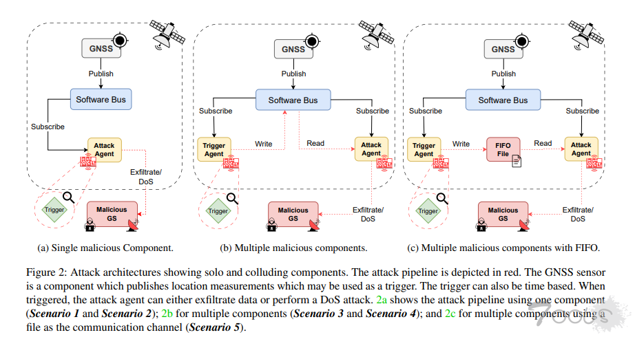 一个应用程序监控卫星 GPS 数据,一旦检测到卫星进入轨道,即开始传输窃取的遥测数据。 - 双组件组合,总线消息传递的时间触发