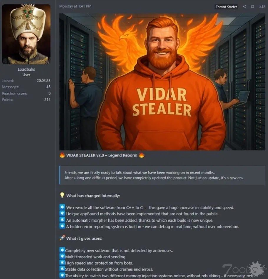 一种名为 Vidar Stealer 的复杂信息窃取恶意软件在 2.0 版发布后经历了彻底的架构转型,引入了高级功能,使其能够通过直接内存注入技术绕过 Chrome 的最新安全保护措施。 该新版本于 2025 年 10 月 6 日由其开发者“Loadbaks”在地下论坛上发布,其特点是完全从 C++ 重写为纯 C,实现了多线程架构,显著提高了其数据泄露速度和逃避能力。 Vidar 2.0 的出现恰逢Lumma Stealer活动的显著下降,这使得 Vidar 成为信息窃取者生态系统中的潜在继任者。 该恶意软件的终身使用价格为 300 美元,为网络犯罪分子提供了一套经济高效但功能强大的工具集,能够系统地瞄准来自浏览器、加密货币钱包、云服务、游戏平台以及包括 Discord 和 Telegram 在内的通信应用程序的凭据。 该恶意软件增强的反分析措施和复杂的凭证提取方法代表了信息窃取威胁形势令人担忧的演变。