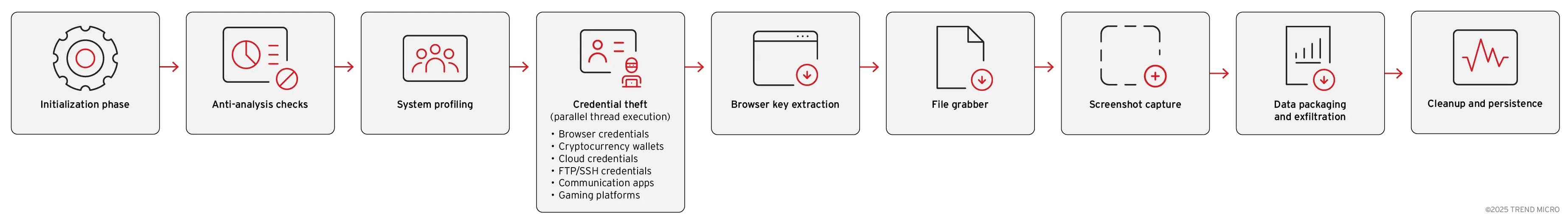 趋势科技分析师发现,最新版本引入了四个重大的架构变化:完全重写 C 语言以增强稳定性和速度,根据受害者计算机规格动态扩展的多线程系统,高级浏览器凭证提取功能,以及为每个构建生成唯一二进制签名的自动多态构建器。