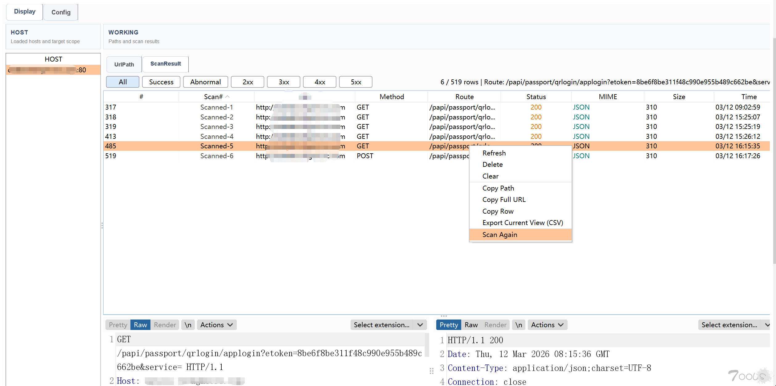 - Recursion Scan按钮:支持递归扫描,会获取UrlPath中的所有路由递归对当前网站的每一层路径进行扫描。