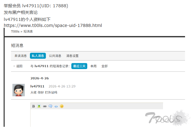 黑产这东西沾上就没好事,今天他发广告,明天就有人来卖数据,后天直接变成交易区。T00ls立这么多规矩不是为了为难谁,就是想让这儿还是个能好好聊技术的地方。举报的人也是好心,版主处理也利索,这种速度挺好的。