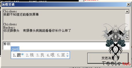 安全研究人员在研究恶意程序的关键日志代码时发生了一件不可思议的事情:一个聊天窗口突然弹出,黑客输入了中文询问“你研究我 的木马干什么”,“想研究出什么来”。聊天功能整合在木马中,他接着说,“我都不知道还能看到屏幕”,“你没有摄像头,有摄像头我就能看看你长什么样 了”。研究人员继续与他聊天,表示要从他手中购买木马,但黑客并不蠢,他随后远程关闭了系统。